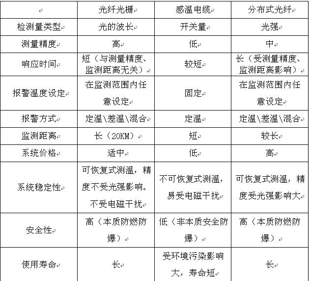 光纤光栅、感温电缆、分布式光纤3种隧道火灾温度类火灾探测技术对比如下:
